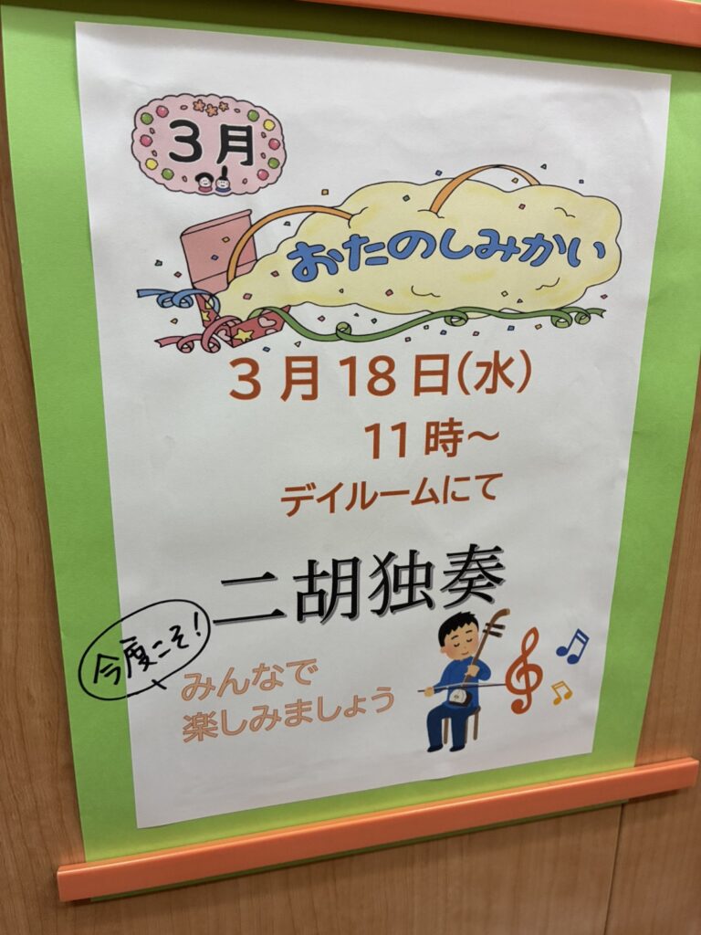 3月は二胡の演奏家さんがボランティアで正直家にお越しいただきます!