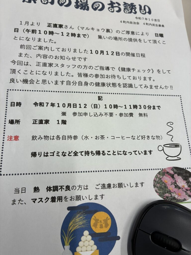 2025.10.14 正直家の社会貢献活動 スタッフブログ 正直家ではデイサービスがお休みの日曜日を、月に一回地域の方々に開放して、茶話会を開いてます🍵今回は健康チェックという事で、皆さんたちの体力測定をさせていただきました💪ほとんどの方に転倒リスクが少ない事がわかりました!測定に夢中になって、測定風景を撮り忘れたので、案内をパチリ💦